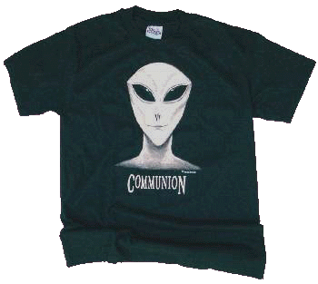 The above shirt was not a promotional item, but rather they were created by artist Steve Neill and sold via Dreamland FX for a brief time in the early nineties. This t-shirt and a detailed latex mask (also created by Steve Neill) were the only Communion related products authorized by Whitley Strieber, and they were sold only via mail order from Steve Neill's catalogue. The image on the shirt, while based on Ted Seth Jacobs' orginal painting (used on the cover of Communion), here is by Mr. Neill. These shirts are no longer available.