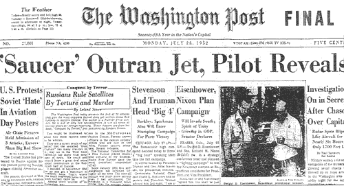 7/19-20/52 | A massive wave of UFOs is observed and tracked by radar for two days and nights over Washington, D.C. (see Washing Post headline below) |